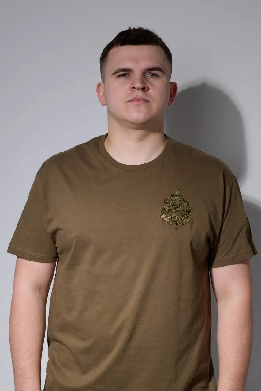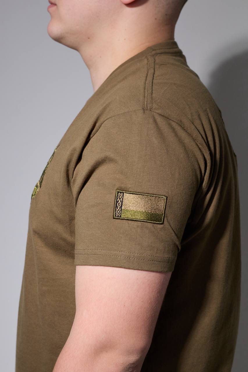 Футболка с машинной вышивкой. Обладает высокой детализацией, яркостью и износостойкостью. Изготовлена из качественного хлопка.