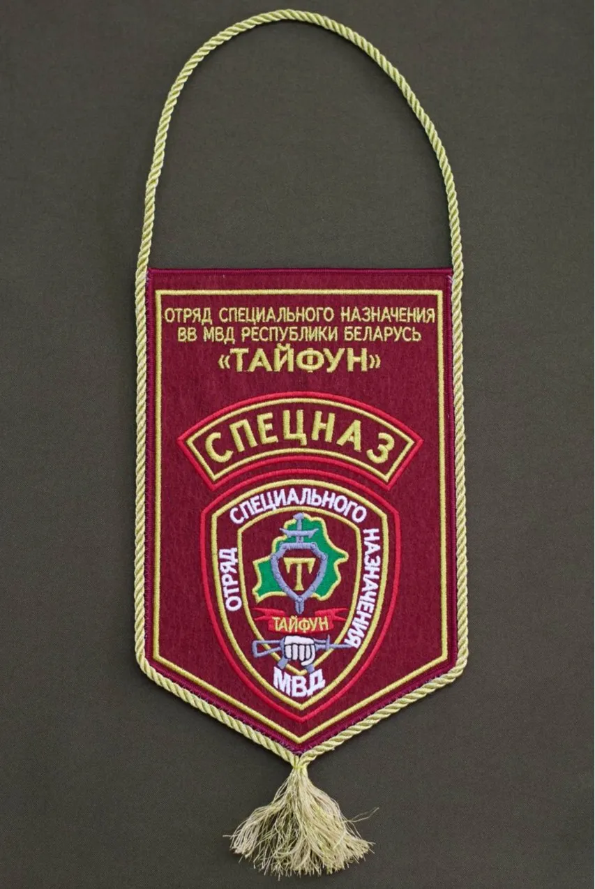 Вымпел с официальной символикой отряда специального назначения «Тайфун». Изготовлен методом машинной вышивки на краповой ткани. Четкая детализация, прочные нитки, стандартный формат.