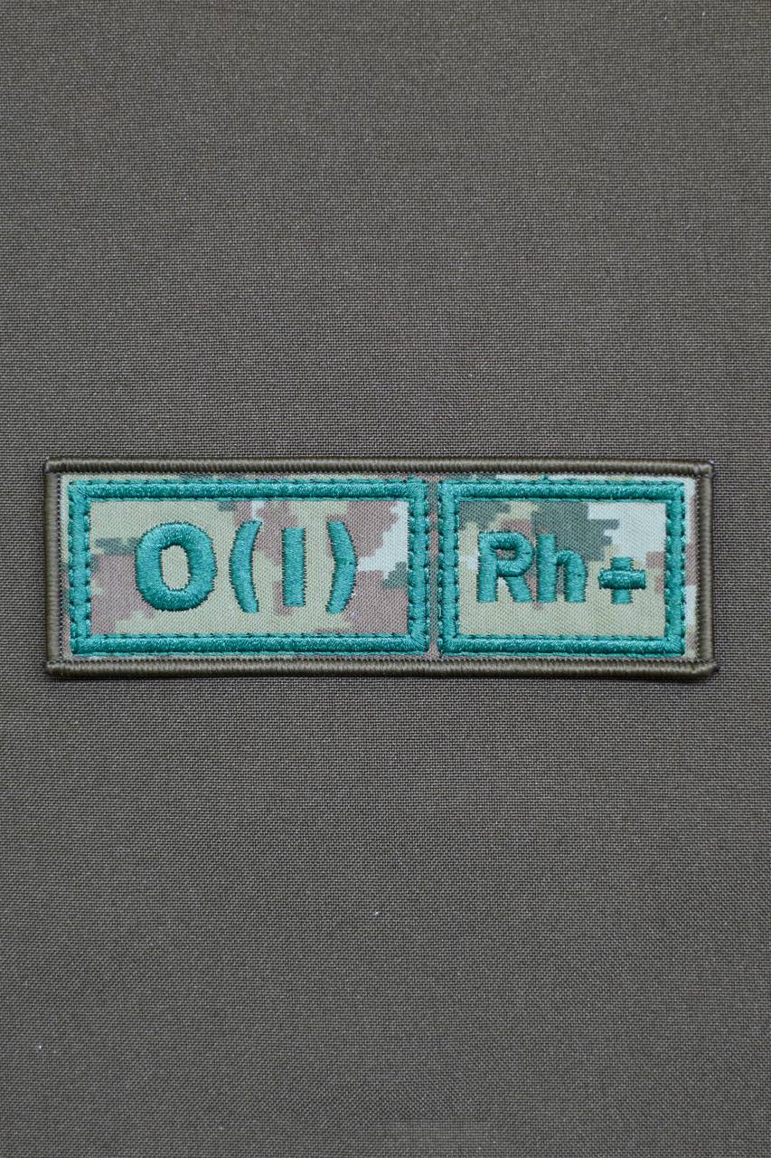 ШЕВРОН ГРУППА КРОВИ 1+ ВЫШИТЫЙ ЗЕЛЁНЫМИ НИТКАМИ НА ТКАНИ КАМУФЛЯЖНОЙ МОХ