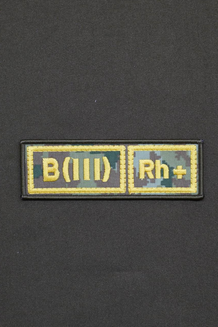ШЕВРОН ГРУППА КРОВИ 3+ ВЫШИТЫЙ ЖЁЛТЫМИ НИТКАМИ НА ТКАНИ КАМУФЛЯЖНОЙ МОХ