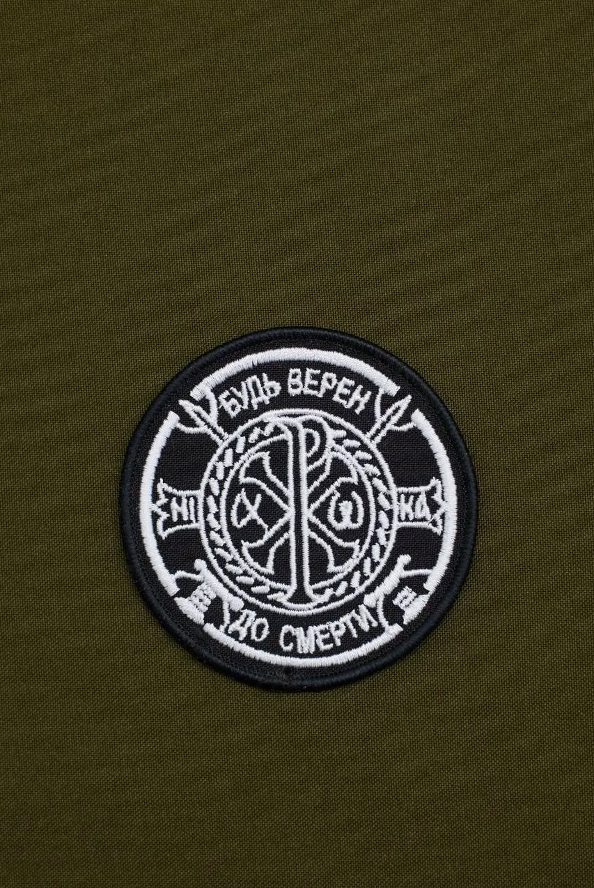ШЕВРОН БУДЬ ВЕРЕН ДО СМЕРТИ ВЫШИТЫЙ БЕЛЫМИ НИТКАМИ НА ЧЁРНОМ ГАБАРДИНЕ