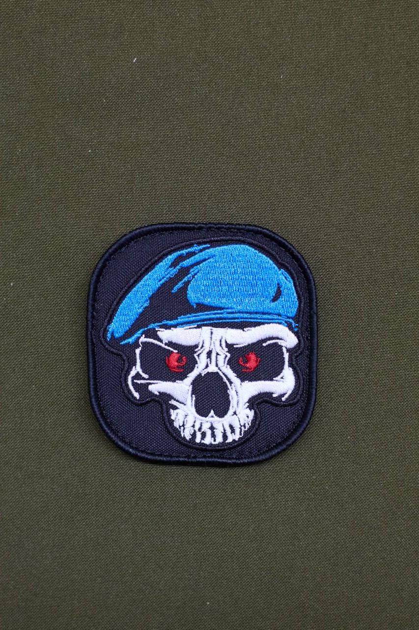 ШЕВРОН ЧЕРЕП В ГОЛУБОМ БЕРЕТЕ ВЫШИТЫЙ ЦВЕТНЫМИ НИТКАМИ НА ЧЁРНОМ ГАБАРДИНЕ